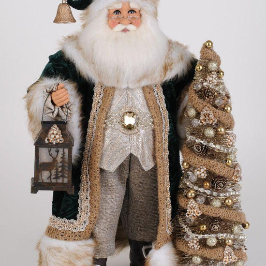 Add a woodland touch to your holiday decor this season with this Emerald Woods Santa. He is dressed in light brown pants with a cream silky shirt and an emerald green coat with light brown accents. He is holding a lantern with deer scene in one hand and a pinecone lit tree with the other. Created by Karen Didion and measures 19 inches in height. The lantern lights up with 3- LR44 batteries, and the tree lights up with 2-CR2032 batteries.