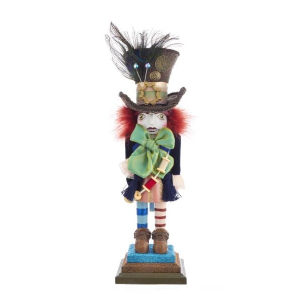 Part of the âAlice in Wonderlandâ collection, the Mad Hatter shows off his top hat with all its feathers, buttons, and watch. He is wearing a big green bow, and a string of bolted thread, and mismatch socks. He has his own style and is proud to show it. Measures 18 inches in height.