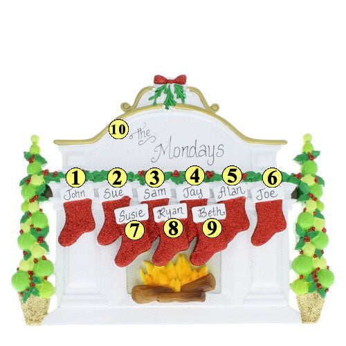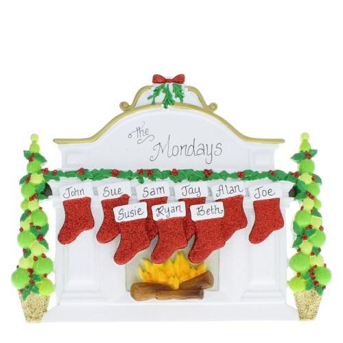 Have this ornament personalized with the names of your family or friends. It features a decorated mantle with 9 red stockings hanging above the fire. This ornament stands on a table with the easel back and does not hang on a tree. Measures 6.25 inches in height.