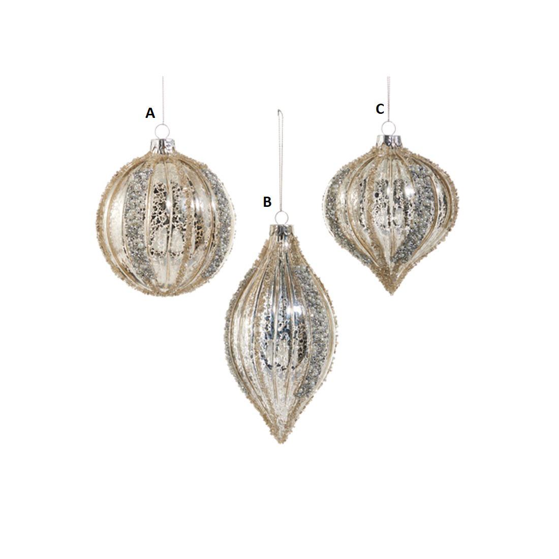 Add a touch of elegance to your holiday decor with this assortment of glittery ornaments. It features three different ornaments to choose from. One is a round ball, one is an onion shape, and the other is a finial drop. Each sold separately and measure 4 - 6 inches in height.