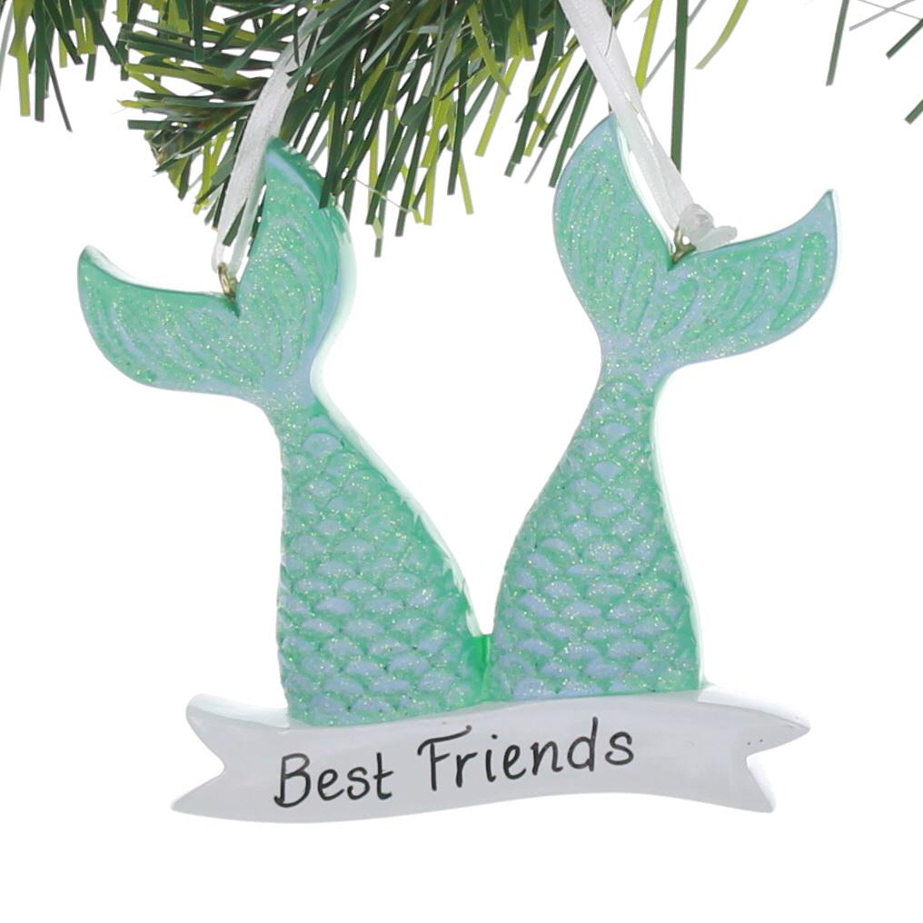 Have this ornament personalized for the mermaid lover in your life. It features two mermaid tails with a ribbon underneath to put their name or a sentiment. Measures 3.63 inches in height.