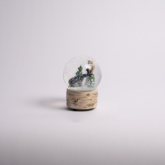 Wind up musical glitter dome water ball with mom and baby bear climbing a tree with a woodland base and forest scene. This water globe measures 5.5 inches in height and it made of resin, glass, metal and water.