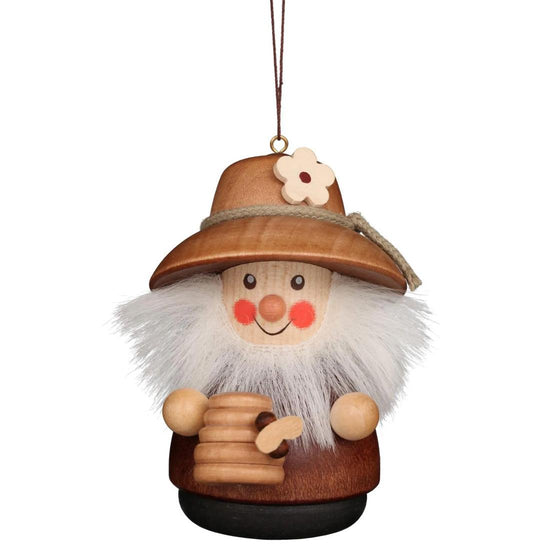 Natural Beekeeper Ornament by Alexander Taron. This natural wood finish ornament features a beekeeper dressed in brown attire, holding a honeycomb in his hand  while a bee swarms about. Measures 3.2 inches in height.