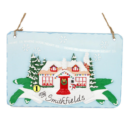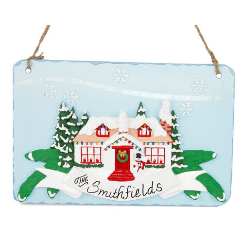 This adorable Our Home Door Plaque displays a snow-laden house decked out in holiday decorations and surrounded by snowy evergreens. A banner displays the family name and across the top is the phrase "Home Is Where Your Heart Is".