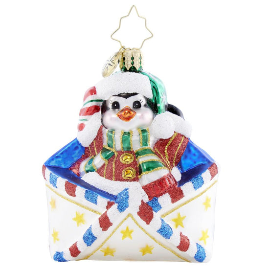 Penguin Deliver Gem Ornament by Christopher Radko. Mail delivery will be a lot more fun with this friendly penguin. Measures 2.5 inches in height.