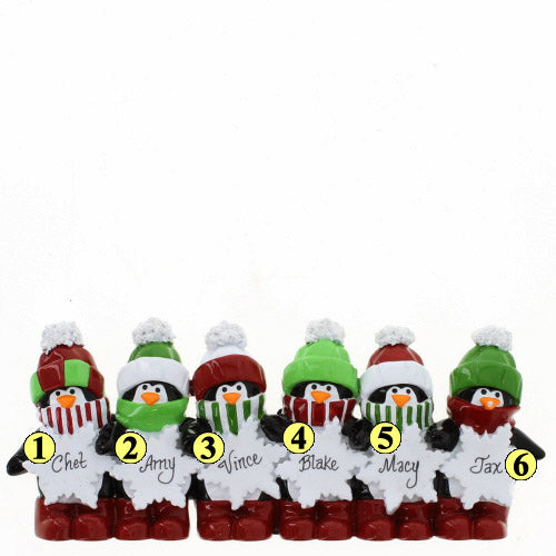 Customize this ornament with the names of your family or friends. It features a family of six penguins dressed in their red, green, and white winter attire, holding a snowflake. This ornament stands on a table with an easel back and does not hang on a tree. Measures 3.25 inches in height.