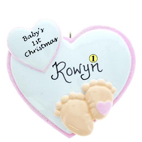 Who doesn't love baby feet? Have this ornament personalized with the name of your baby girl. It features baby feet on a white heart with pink trim that has the pre-printed words "Baby's 1st Christmas" in a small heart above. Measures 4 inches in height.