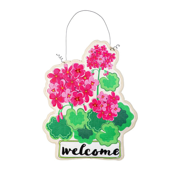 Welcome your family and friends to your home with this door decor. It features blooming pink geraniums and the word âWelcomeâ. Measures 25.5 inches in height.
