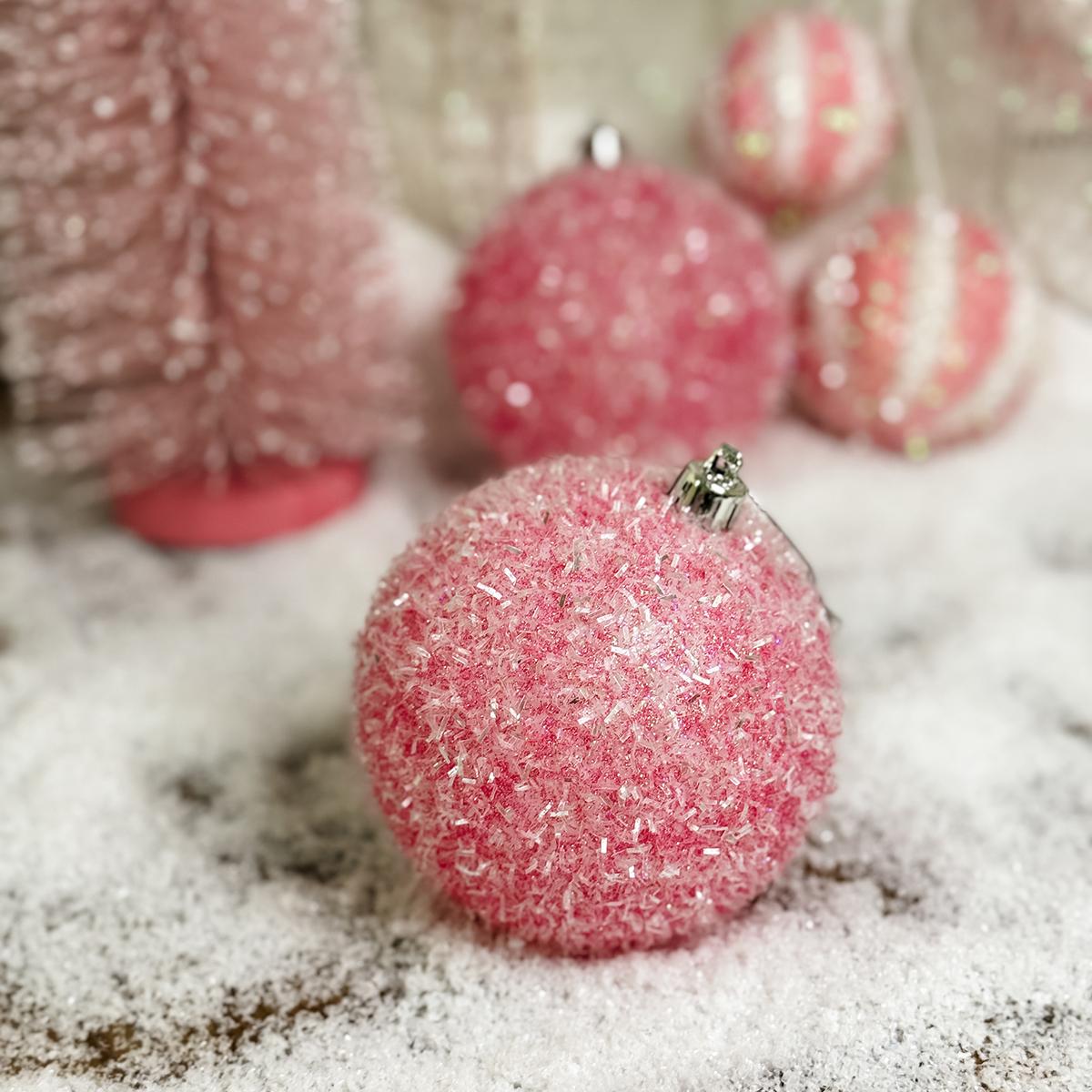 Set of 4. Pretty in sparkling pink tinsel! A unique addition to a holiday arrangement or Christmas decor! Covered in pink tinsel and sparkling beads, this plastic ornament has a 4 inch diameter.Â