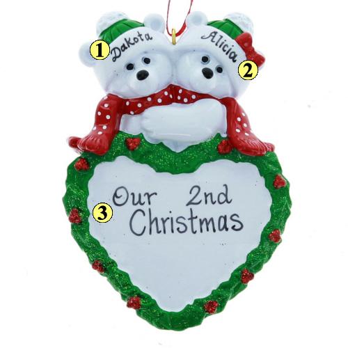 Customize this Polar Bear couple ornament with the names of your loved ones. It features two polar bears dressed in red and green winter attire with a big heart below them. Measures 4 inches in height.Â