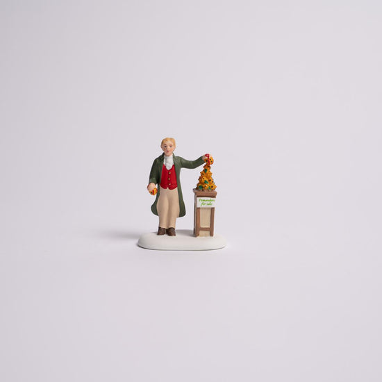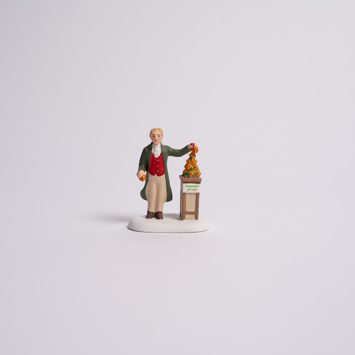The fruit vender also sells pomanders, oranges stuffed with whole cloves and when dried are used to scent a drawer or closet. Coordinates with âDicken's Market Fruit Standâ Item #6009735.