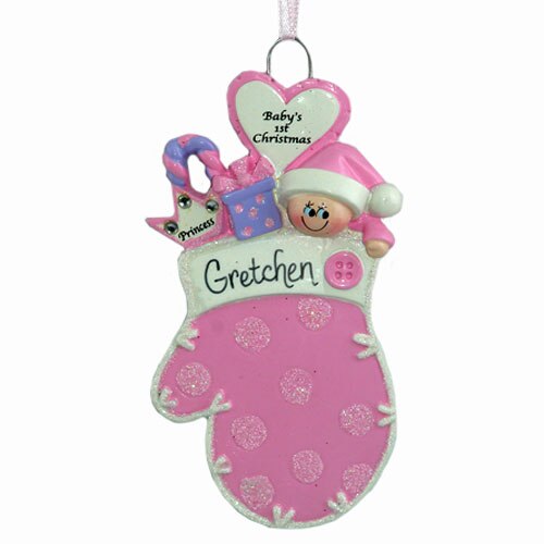 Celebrate your baby girl's first Christmas with this pink mitten ornament. Pre-printed on the heart with "Baby's First Christmas" and "Princess" on the crown. Measures 4.5 inches in height.