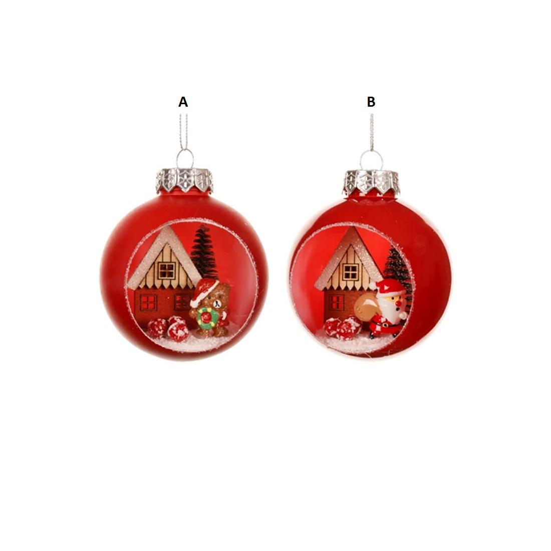 Add some fun to your holiday decor with this assortment of shatterproof ornaments. It features red ornaments with two different scenes to choose from. One is a bear standing in the snow, in front of a cabin wearing a Santa hat and holding a wreath in his hands. The other one is a scene of Santa leaving a house in the snow with his sack of toys on his back. Each sold separately and measure 3.15 inches in diameter.