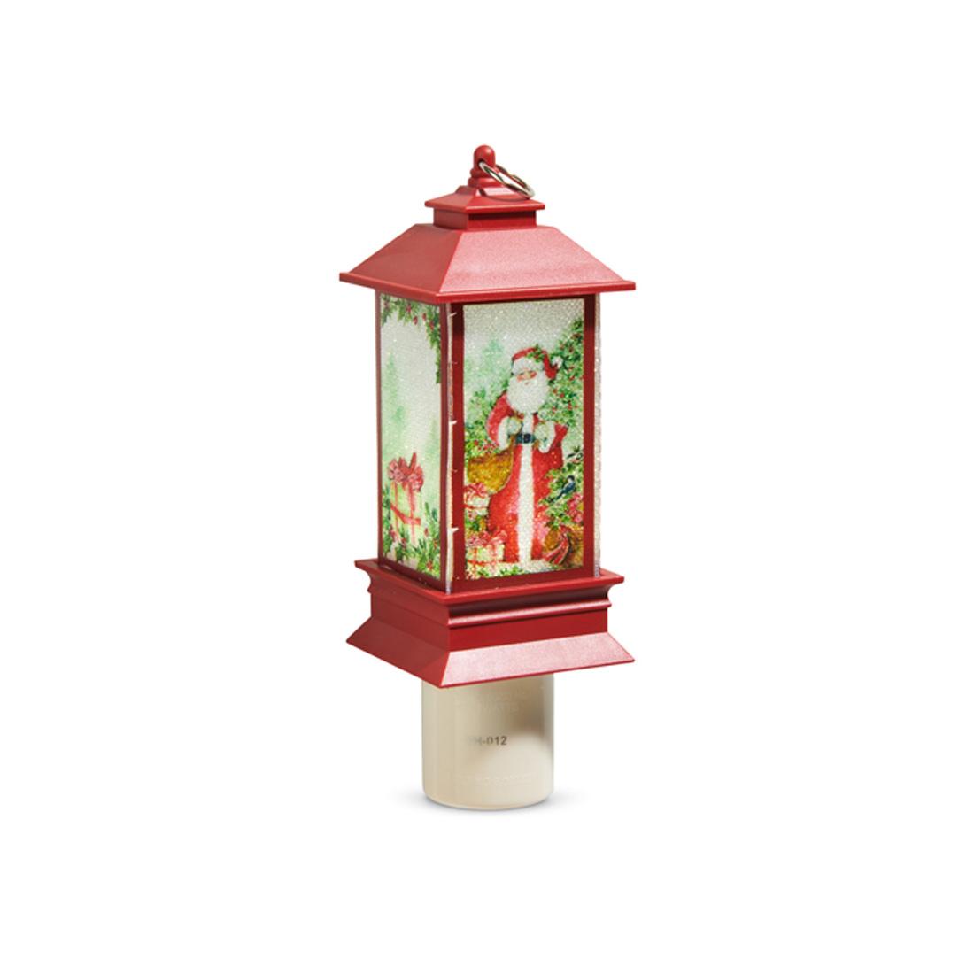 Celebrate the holiday season with this night light shining in your home. It features a scene of Santa with gifts inside a red lantern. Measures 6.5 inches in height.