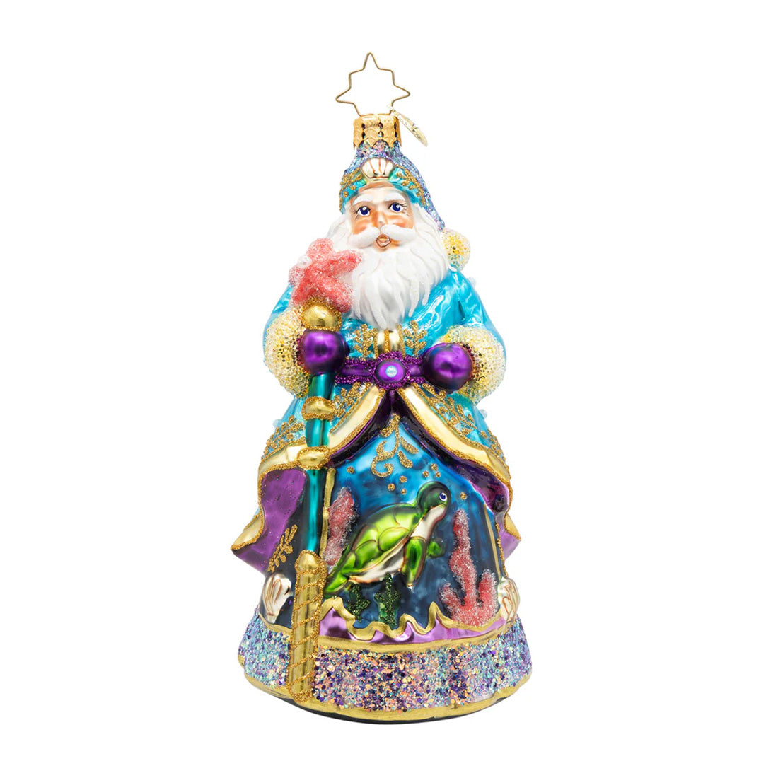 Santa Of The Sea Ornament by Christopher Radko was handmade in Europe. It features Santa dressed in an aqua blue cloak with purple and gold trim, holding a starfish staff in his hand. There is a beautiful ocean scene on the front of his robe showing a sea turtle swimming amongst the coral reef.