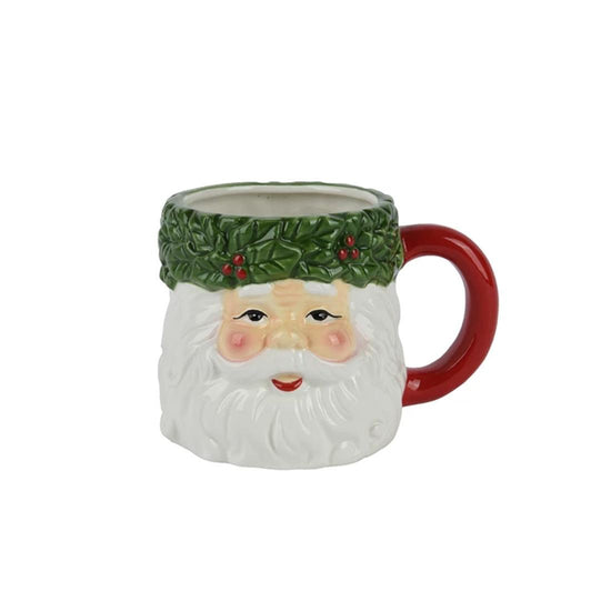 Celebrate the holiday season by sipping some warm cocoa with your loved ones using this mug. It features a Santa face with rosy cheeks and a wreath around his head. Measures 3.74 inches in height. Food safe. Not safe for microwave or dishwasher use.