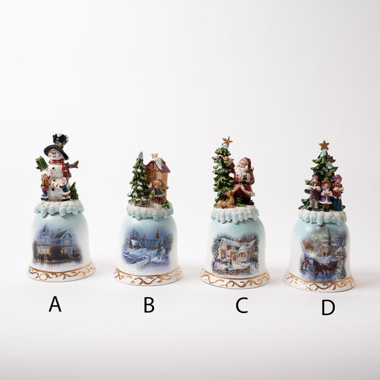 There are four different bells you can choose from in this assortment. One has a snowman in a big top hat, holding a present with two sweet little kids standing around him, another has a person standing in front of their home with a big Christmas pine next to them, another has Santa decorating a Christmas tree with a sweet little deer laying in front of him watching him, and the last one has three different carolers singing Christmas songs in front of a Christmas tree. Each sold separately and measure 6.25 inches in height.