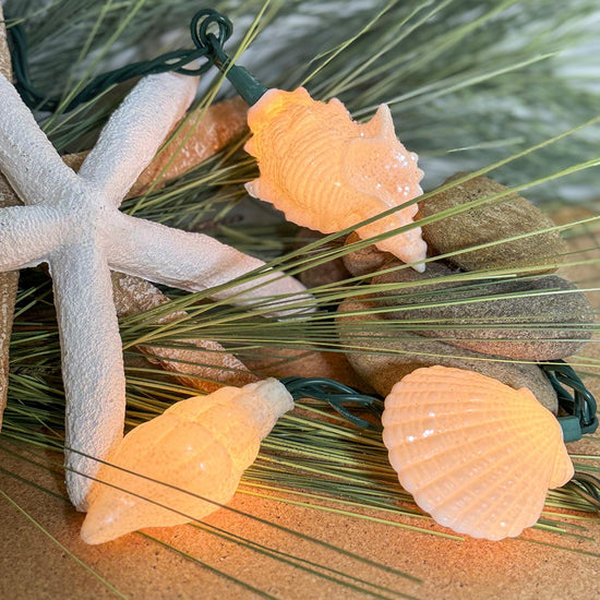 If you love the beach, let people know with this light set, which comes with 10 white seashell lights. The 10 lights are separated by 12 inch spacing and the entire strand measures 11.5 feet in length. Includes 4 spare clear bulbs and 1 spare fuse. Indoor/Outdoor use.