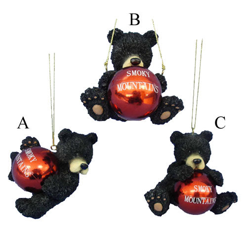 Three versions of a black teddy bear holding a red Christmas ball with Great Smoky Mountains in writing on it. Comes in three different poses and each sold separately.