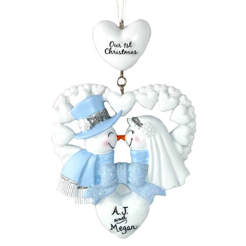 Celebrate your first Christmas together as a married couple by having this ornament personalized with your names on it. It features a snowman bride and groom surrounded by a white heart shape and a small heart above them with the pre-printed words âOur 1st Christmasâ. Measures 5 inches in height.