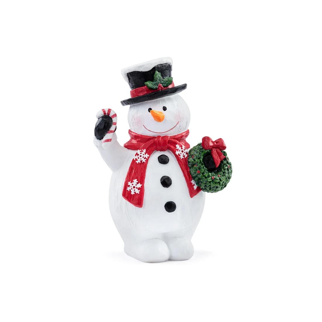 Brighten up your home through the Winter season by displaying this snowman in your home. He is wearing a big smile on his face, a black top hat and red scarf, while holding a wreath in one hand and a candy cane in the other.