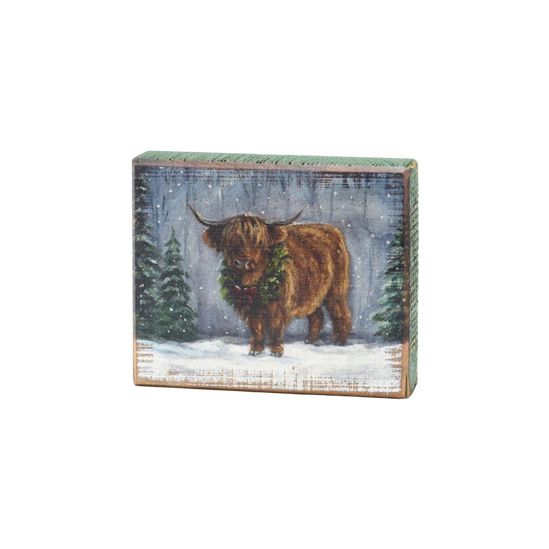 Snowy Highland Block Sign from Primitives by Kathy. If you have a farm theme for the holidays, then you may want to add this block sign to your decor. It features a highland cow wearing a Christmas wreath, standing in a snowy field. Measures 5.5 inches in height. Can hang on the wall or stand alone.