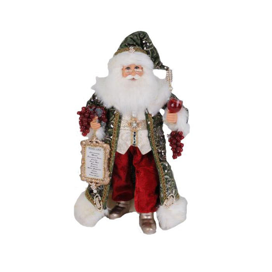 Add this elegant Santa to your Christmas display this year. He is wearing a sparkling green coat over a cream shirt and red pants and is making a toast with a glass of his favorite wine in one hand and a wine list in the other. Created by Karen Didion and measures 17 inches in height.