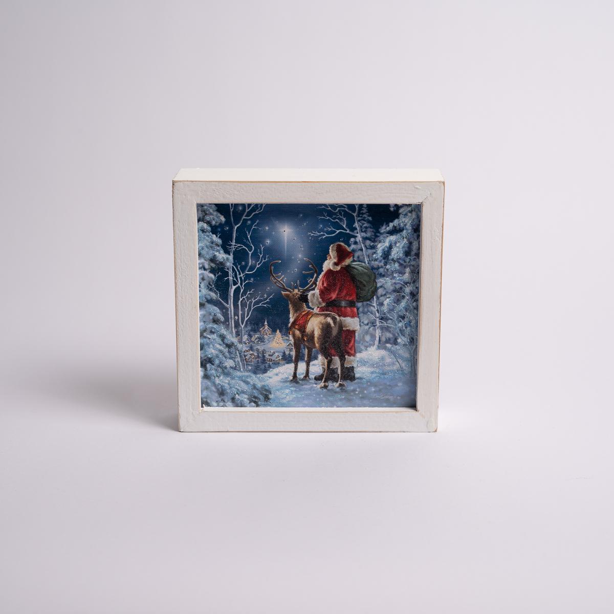 Santa looks upon the Christmas Star, while the town below sleeps. A loyal reindeer by his side. LED Lighted Shadow Box 8 x 8.