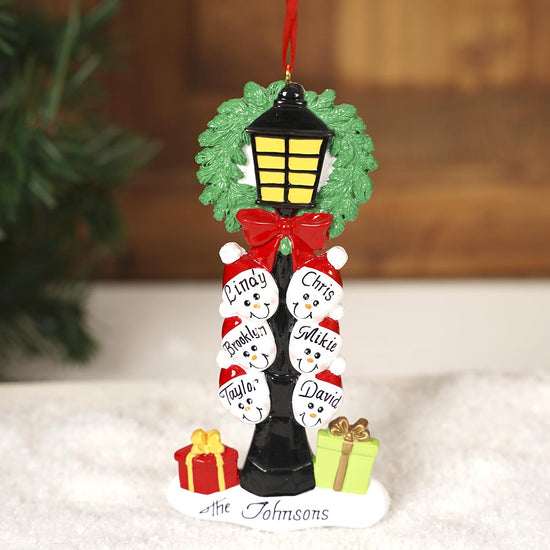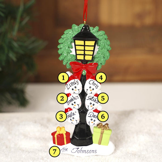 Customize this ornament with the names of your family members. It features a lit street light with a wreath and big red bow at the top, six faces underneath, and presents in a mound of snow at the base.Â