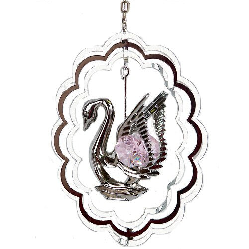 A pair of pink faceted crystals give color to the wings of this silver swan dangling inside a trio of scalloped ovals. This lovely silver ornament also serves as a light catcher.