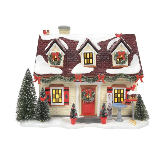 The Cardinal House by Department 56 is part of the âSnow Villageâ collection. This house welcomes all cardinals to come visit with a welcome sign placed out front. It is decorated for the holiday season with garland and wreaths and big red bows. The cardinals blend right in. Measures 7.68 inches in height. Lights up using USB adapter. Coordinates with #6013583.