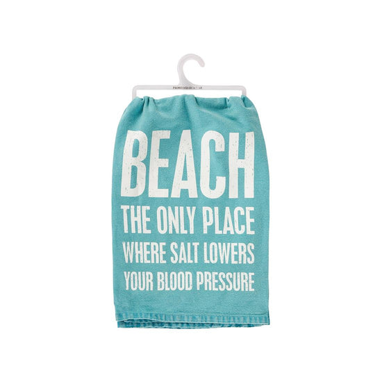 The Only Place Kitchen Towel from Primitives by Kathy. If you have a beach theme in your kitchen, you may want to add this cotton towel to your decor. It features an aqua blue towel with a beach inspired sentiment that reads âBeach, The Only Place Where Salt Lowers Your Blood Pressureâ. Measures 28 inches in length.