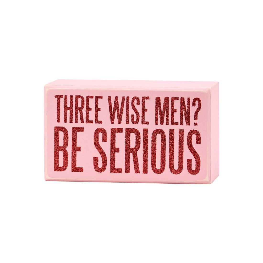 Three Wise Men Box Sign from Primitives by Kathy. This small wooden box sign has a fun sassy Christmas sentiment that reads âThree Wise Men? Be Serious". Measures 3.5 inches in height. Can hang on the wall or stand alone.