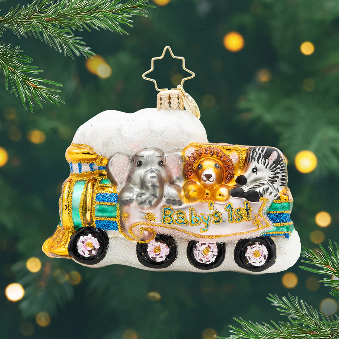 Tiny Travelers Gem Ornament by Christopher Radko was handmade in Europe. It features a train filled with animals off on an adventure. The train is blue, green, and pink with gold accents and has a banner that reads “Baby's 1st”.