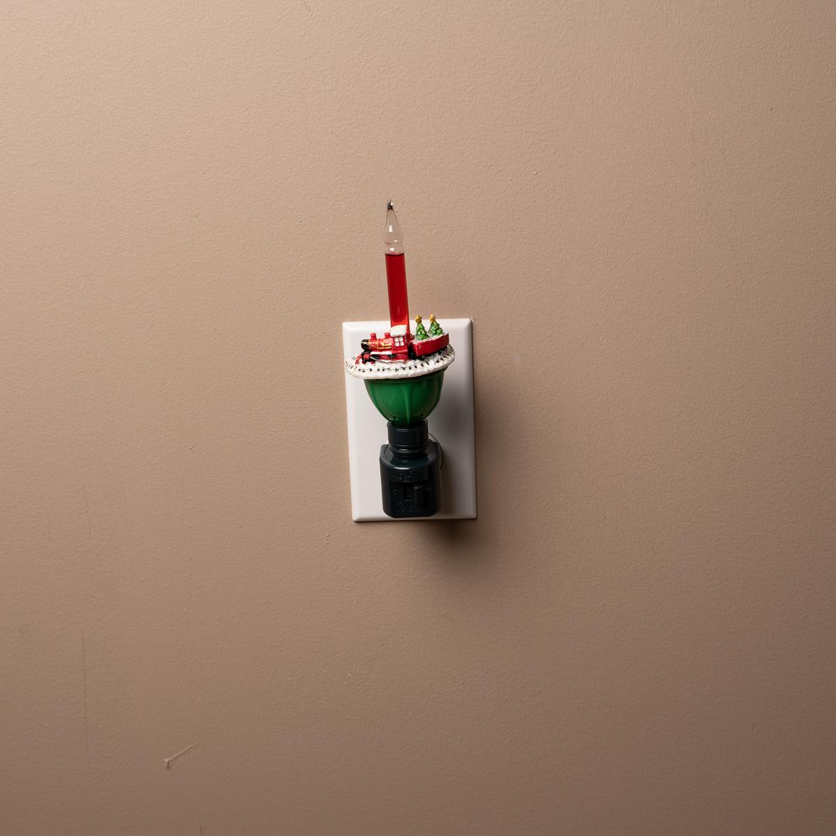 This bubble nightlight features a train on the tracks hauling Christmas trees and measures 7 inches in height.