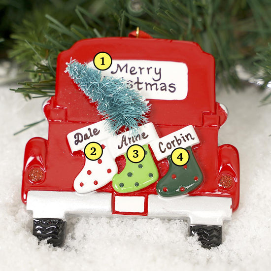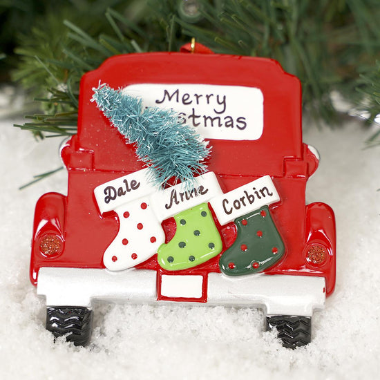 Personalize this ornament with the names of your family or friends. It features a red truck with three stockings on the tailgate and a tree in the back.Â