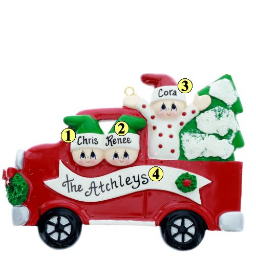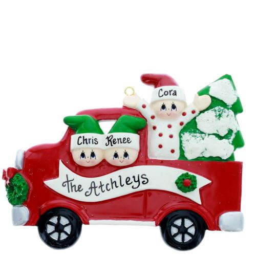 Personalize this ornament with the names of your family or friends. It features a family of three in their red truck with a freshly cut Christmas tree in the back. Measures 4 inches in height.