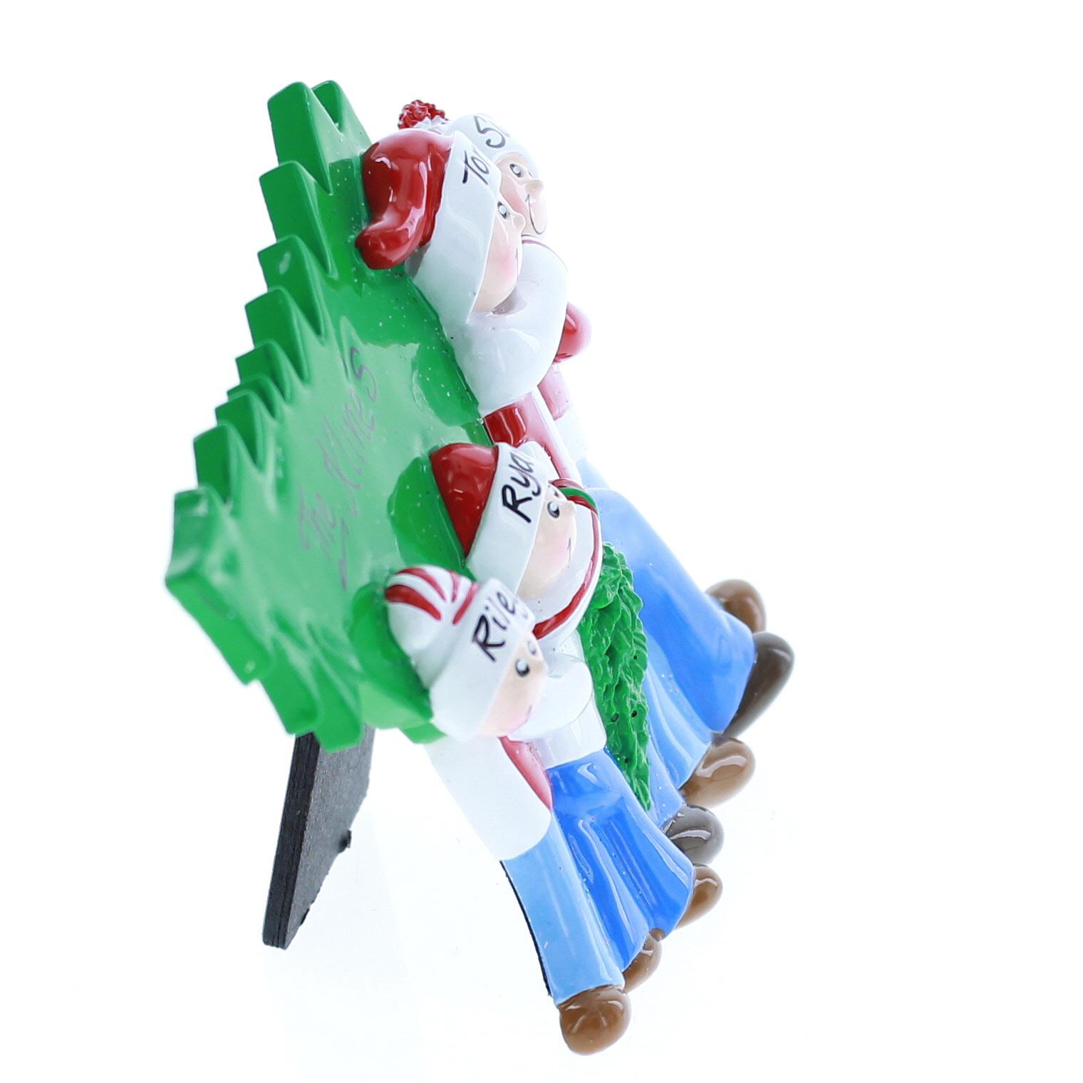 Personalize this ornament with the names of your family or friends. It features a family of four wearing Santa hats and carrying the perfect Christmas tree to their home. This ornament stands on a table with an easel back and does not hang on a tree. Measures 4.38 inches in height.