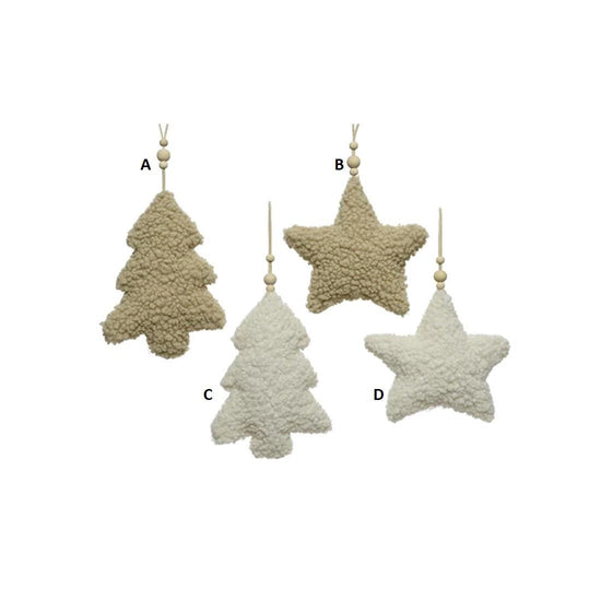Decorate your tree for the holiday season with this assortment of polyester ornaments. It features a brown or white fluffy tree or star with wooden beads at the top. Each sold separately and measure 8.66 inches in height.