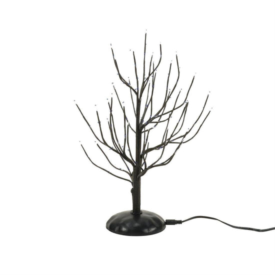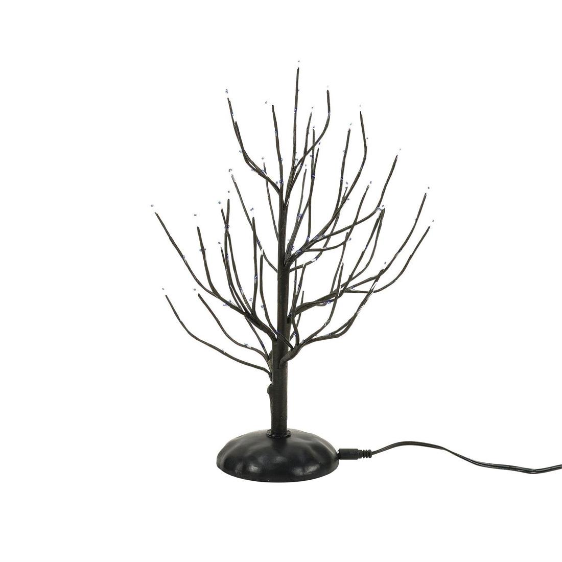 Twinkle Branch Tree Black by Department 56 can be used in any village display. Add some magic to your Halloween display with this black tree. It has specks of fiber optic lights with multi colors using the multi-function remote control included. Measures 11.02 inches in height. USB adapter included.