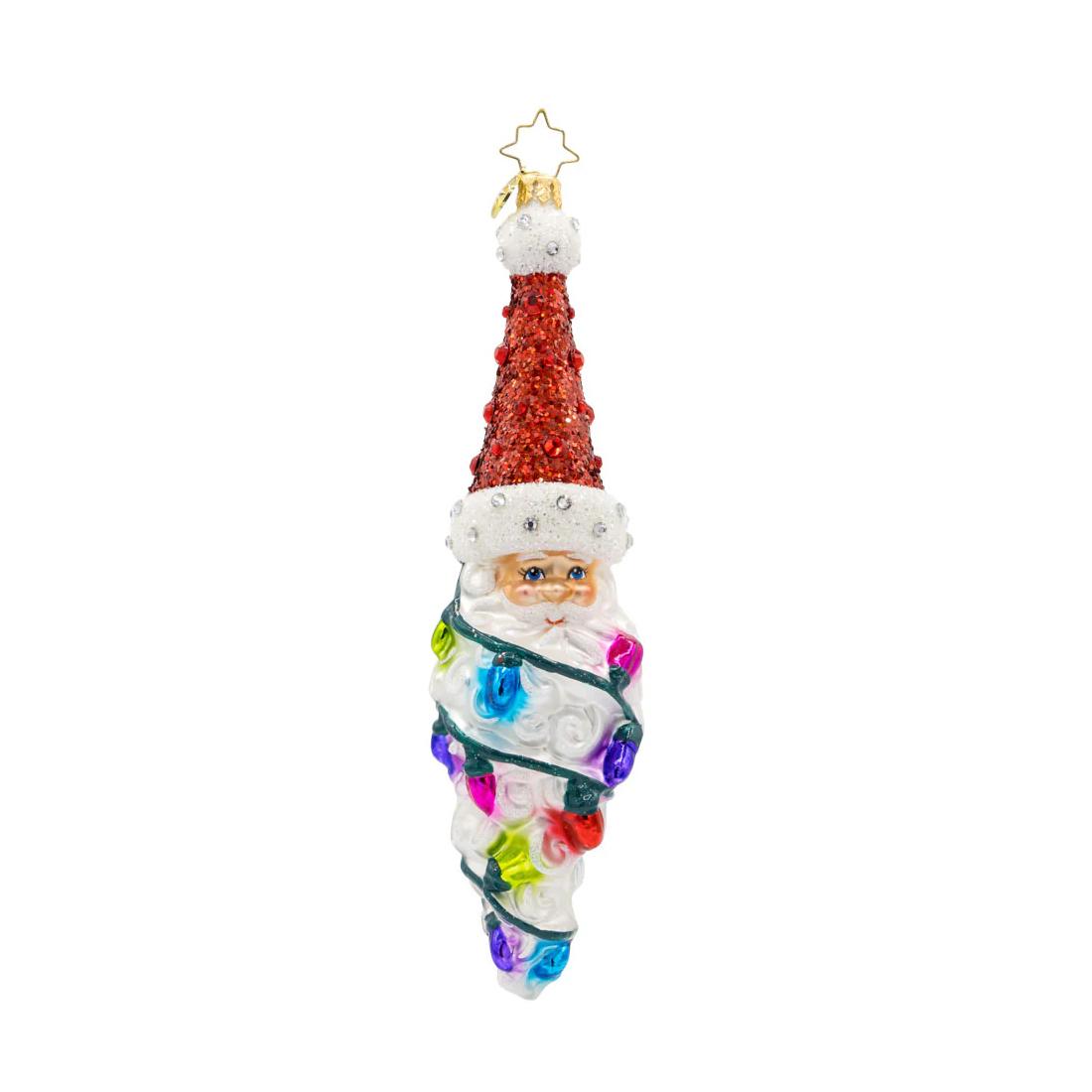 Twinkling Twist Ornament by Christopher Radko features a Santa head with his beard twisted up in Christmas lights to form a finial shape. Even Santa gets caught up in the decoration process! Measures 7.5 inches in height.