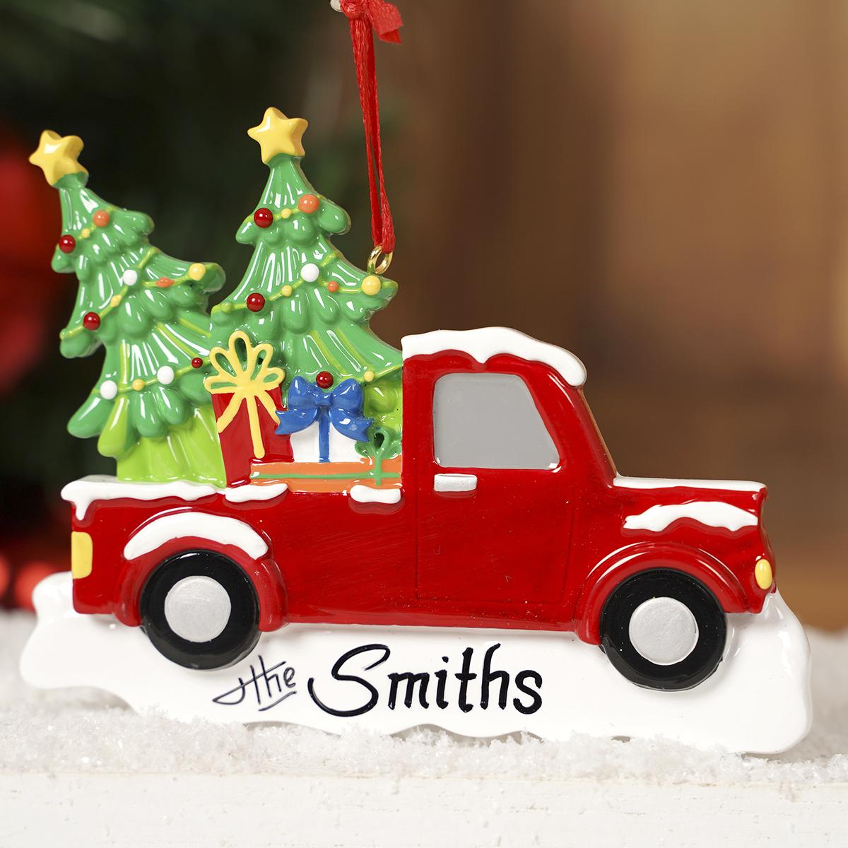 Have this ornament personalized for your family. It features a red vintage truck parked in the snow with two decorated Christmas trees and presents in the back.Â