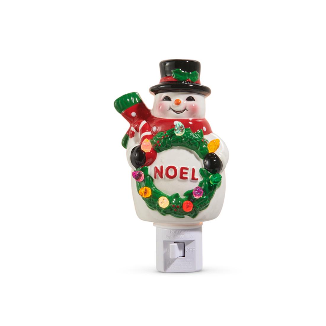 Light up the holiday season by displaying this little snowman night light. He is wearing a top hat and scarf, he holds a wreath in his hands and has the word âNoelâ on his tummy. Measures 5.75 inches in height.