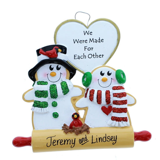 Customize this ornament with the names of your favorite couple. It features a snow couple standing on a rolling pin with a heart above them pre-printed with "We Were Made For Each Other". Measures 4.13 inches in height.