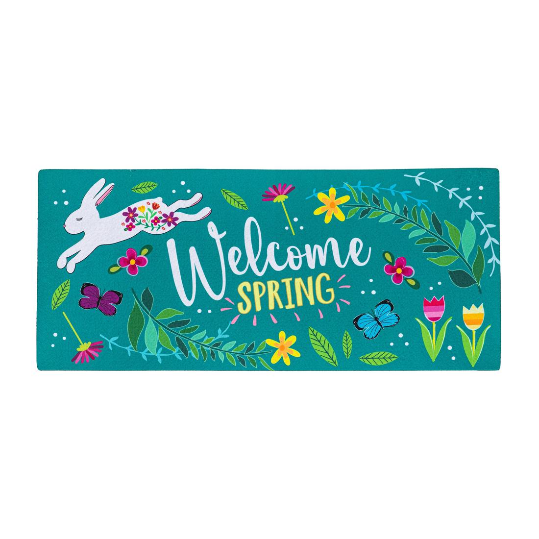 Greet your guest with this Welcome Spring Sassafras Switch Mat. It features a white rabbit hopping through a field of flowers and the words âWelcome Springâ. Measures 22 inches in width. It is mildew resistant and features an anti-slip backing. Spot clean with soap and water.