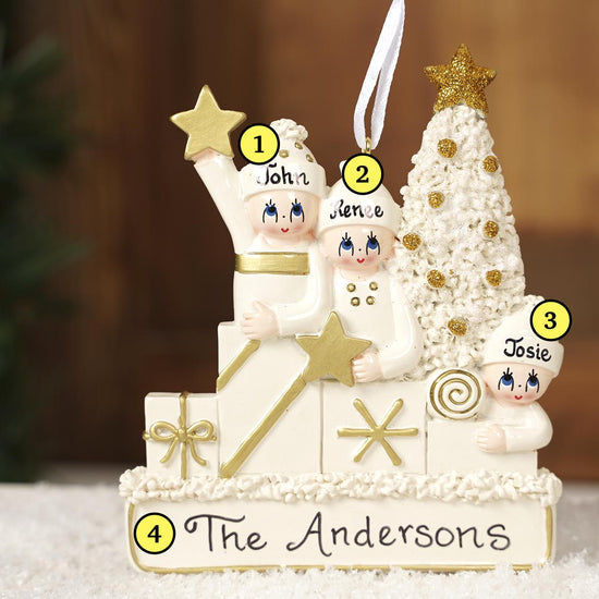 Have this ornament personalized for the family members in your life. It features a family of three celebrating Christmas together dressed in white and gold, with a Christmas tree behind them and presents beneath them.
