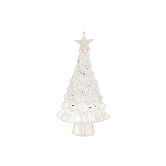 Add a touch of elegance to your holiday decor with this white glitter tree ornament. Measures 7.25 inches in height.