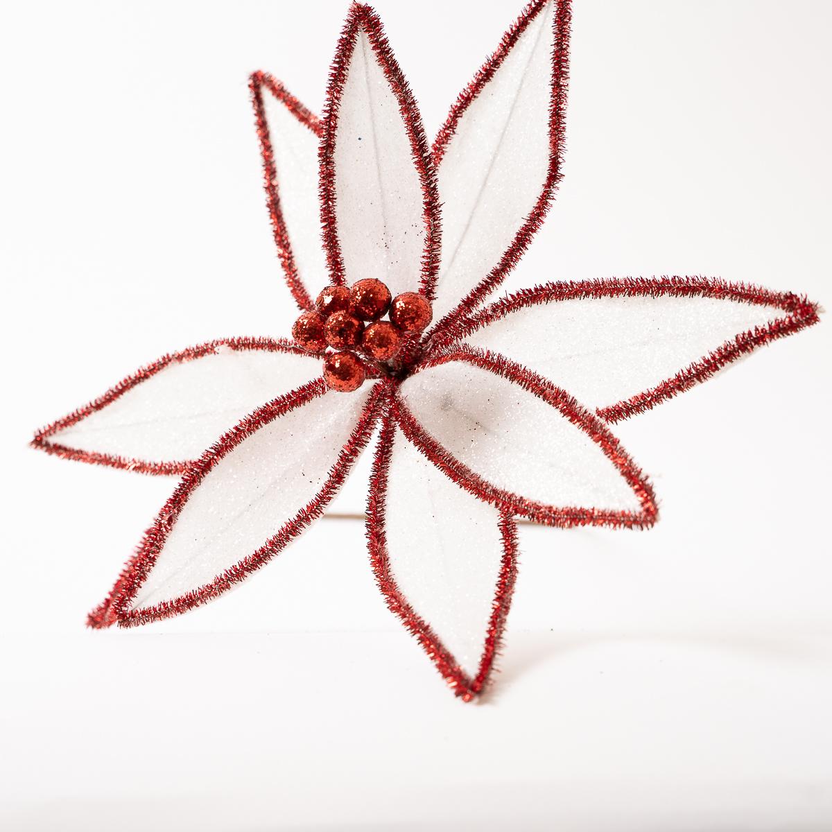 This beautiful white flower features red trim around each petal and has a beautiful bunch of red berries in the center.