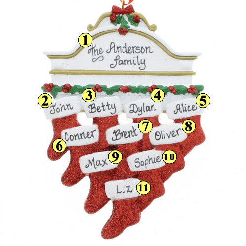 Customize this White Mantle family of 10 ornament with the names of your family members. It features a white mantle with 10 red stockings hanging below. Measures 5.5 inches in height.