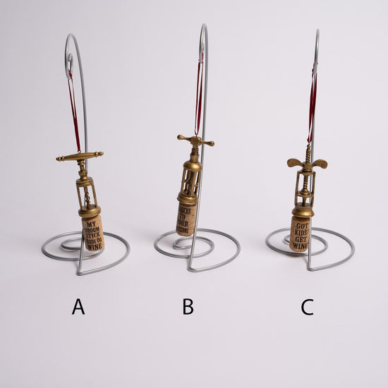 This assortment of wine cork ornaments feature different sayings. One says âMy Broomstick runs on wine", another says âCheers to pour decisions", and the other says âGot kids, get wineâ. Each sold separately and measure 5 inches in height.